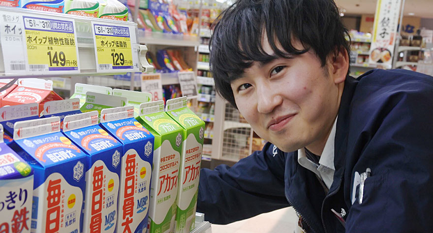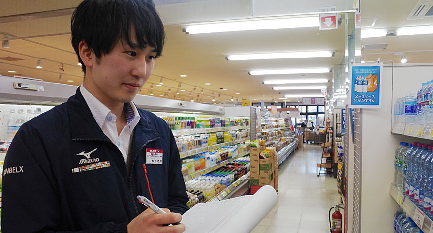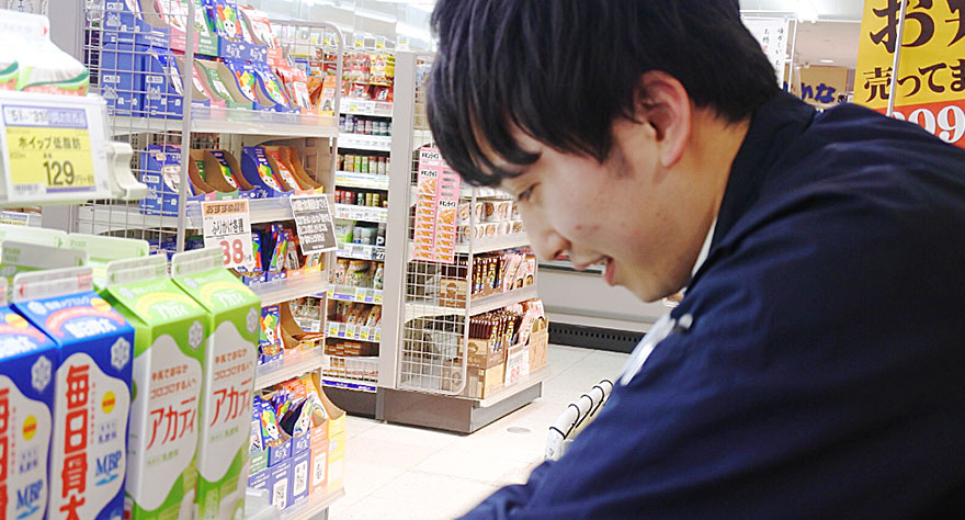 日配品、加工食品の品出しや発注業務が主な仕事内容です。配属前は品出しだけだとつまらないだろうなと思っていたのですが、実際に業務をやってみるとただの品出しだけではなく売場作りなどもするので今は面白いと感じています!